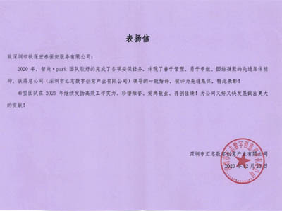 2020年,鐵保宏泰保安公司駐點(diǎn)智美.park團(tuán)隊(duì)較好的完成了各項(xiàng)安保任務(wù),體現(xiàn)了善于管理、勇于奉獻(xiàn)、團(tuán)結(jié)凝聚的先進(jìn)集體精神,獲得總公司(深圳市匯志數(shù)字創(chuàng)意產(chǎn)業(yè)有限公司)領(lǐng)導(dǎo)的一致好評(píng),被評(píng)為先進(jìn)集體,特此表彰!