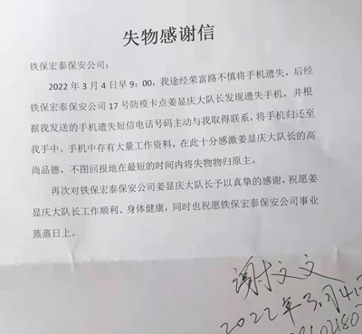 我司鐵保宏泰深圳保安公司安保員姜顯慶隊(duì)長在防疫卡點(diǎn)拾到手機(jī)一臺。失主特致信表示感謝。