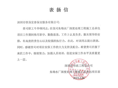 深圳市市政工程總公司朱坳水廠深度處理工程施工總承包項(xiàng)目部致信表?yè)P(yáng)我司鐵保宏泰深圳保安公司安保隊(duì)員牛華鋒同志工作期間恪盡職守,勤勤懇懇,工作上認(rèn)真負(fù)責(zé),服從領(lǐng)導(dǎo)的安排,有高度的責(zé)任心以及較強(qiáng)的執(zhí)行力。特致信提出表?yè)P(yáng)。