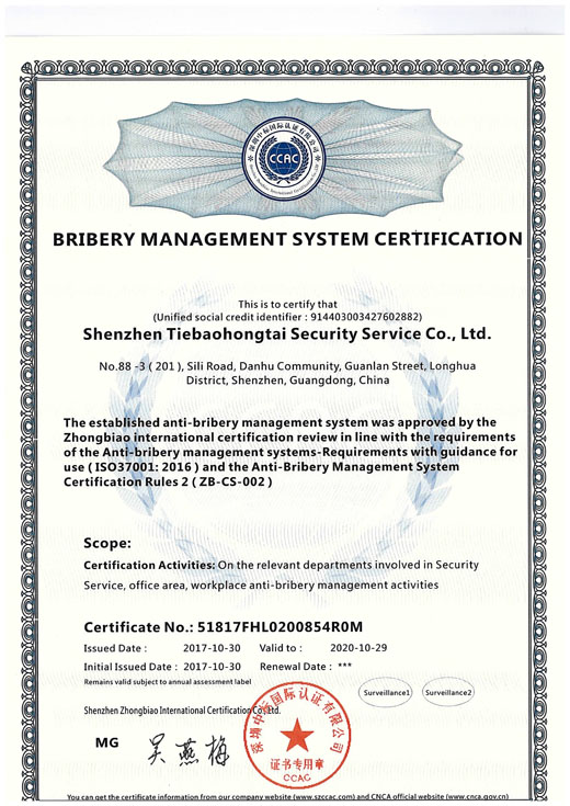 熱烈祝賀我司深圳鐵保宏泰保安服務(wù)有限公司榮獲反賄賂管理體系認(rèn)證證書。