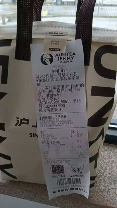 11月19日保安門崗突然收了個外賣說是送給保安的,經(jīng)確認才知道是那天那個女孩子點的送給保安員的。