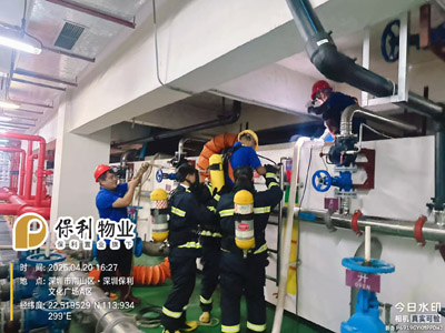 2026 年 4 月 20 日 16:20,深圳南山保利文化廣場組織開展有限空間作業應急演練。本次演練在保利秩序部謝經理、工程部陳經理、客服部鄧經理的統籌帶領下,由深圳市鐵保宏泰保安服務有限公司駐場保安隊與深圳市瀅水水處理技術有限公司作業人員聯合參與,針對廣場負二樓水泵房生活水池清洗有限空間作業,提前開展專項應急演練。
