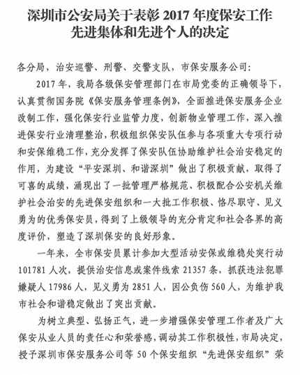 深圳市公安局關(guān)于表彰2017年度保安工作,先進集休和先進個人的決定