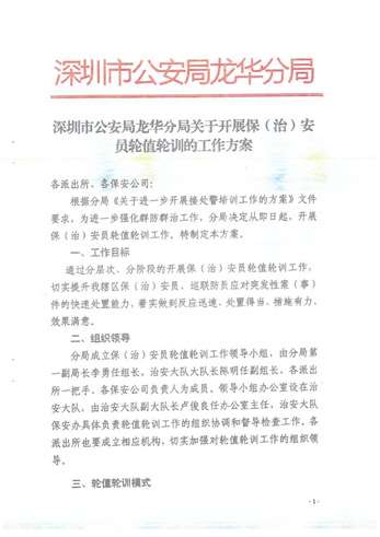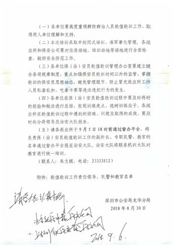 2018年9月6日深圳市公安局龍華分局在龍華分局大樓1605會(huì)議室召開(kāi)了保安工作推進(jìn)會(huì)議。會(huì)議主要學(xué)習(xí)了深圳市公安局龍華分局關(guān)于開(kāi)展保(治)安員輪值輪訓(xùn)的工作方案。
