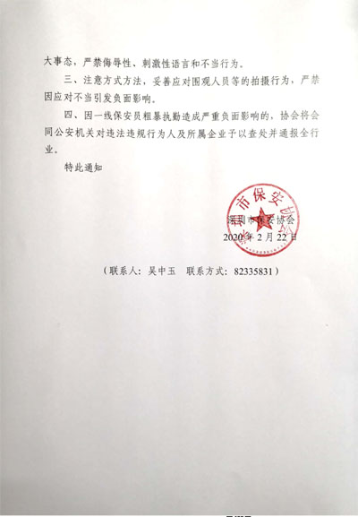 自抗擊新冠病毒疫情以來,根據(jù)省內(nèi)外媒體近期一些報(bào)道,個(gè)別保安員在防疫一線工作中存在不同程度的暴力值崗執(zhí)勤現(xiàn)象,嚴(yán)重?fù)p害了保安隊(duì)伍形象,同時(shí)在社會(huì)上造成嚴(yán)重的負(fù)面影響。為此,根據(jù)各級(jí)領(lǐng)導(dǎo)指示,協(xié)會(huì)有必要進(jìn)一步規(guī)范防疫期間一線保安員崗位的執(zhí)勤紀(jì)律,避免防疫行動(dòng)中出現(xiàn)背離法治、文明精神、社會(huì)公德的粗暴行為,以及這些行為所引發(fā)的不良社會(huì)影響。現(xiàn)將保安員防疫文明值崗執(zhí)勤要求通知如下: