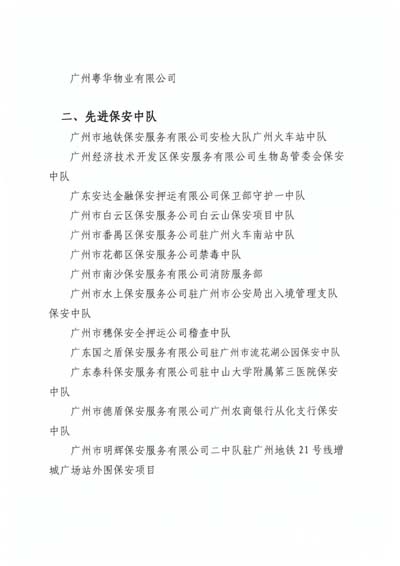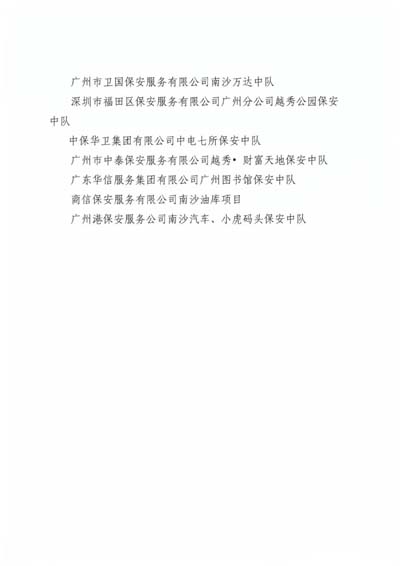 廣州市保安協(xié)會(huì)2019年度先進(jìn)保安集體”榮譽(yù)稱號(hào);授予廣州市保安服務(wù)總公司等10個(gè)單位“廣州市保安協(xié)會(huì)2019年度最具發(fā)展?jié)摿Ρ0卜?wù)企業(yè)”榮譽(yù)稱號(hào);授予廣州市番禺區(qū)保安培訓(xùn)中心等3個(gè)單位“廣 州市保安協(xié)會(huì)2019年度優(yōu)秀保安培訓(xùn)單位”榮譽(yù)稱號(hào);授予王亞勛等10名培訓(xùn)師“廣州市保安協(xié)會(huì)2019年度優(yōu)秀保安培訓(xùn)師”榮譽(yù)稱號(hào)(名單詳見下文)。
